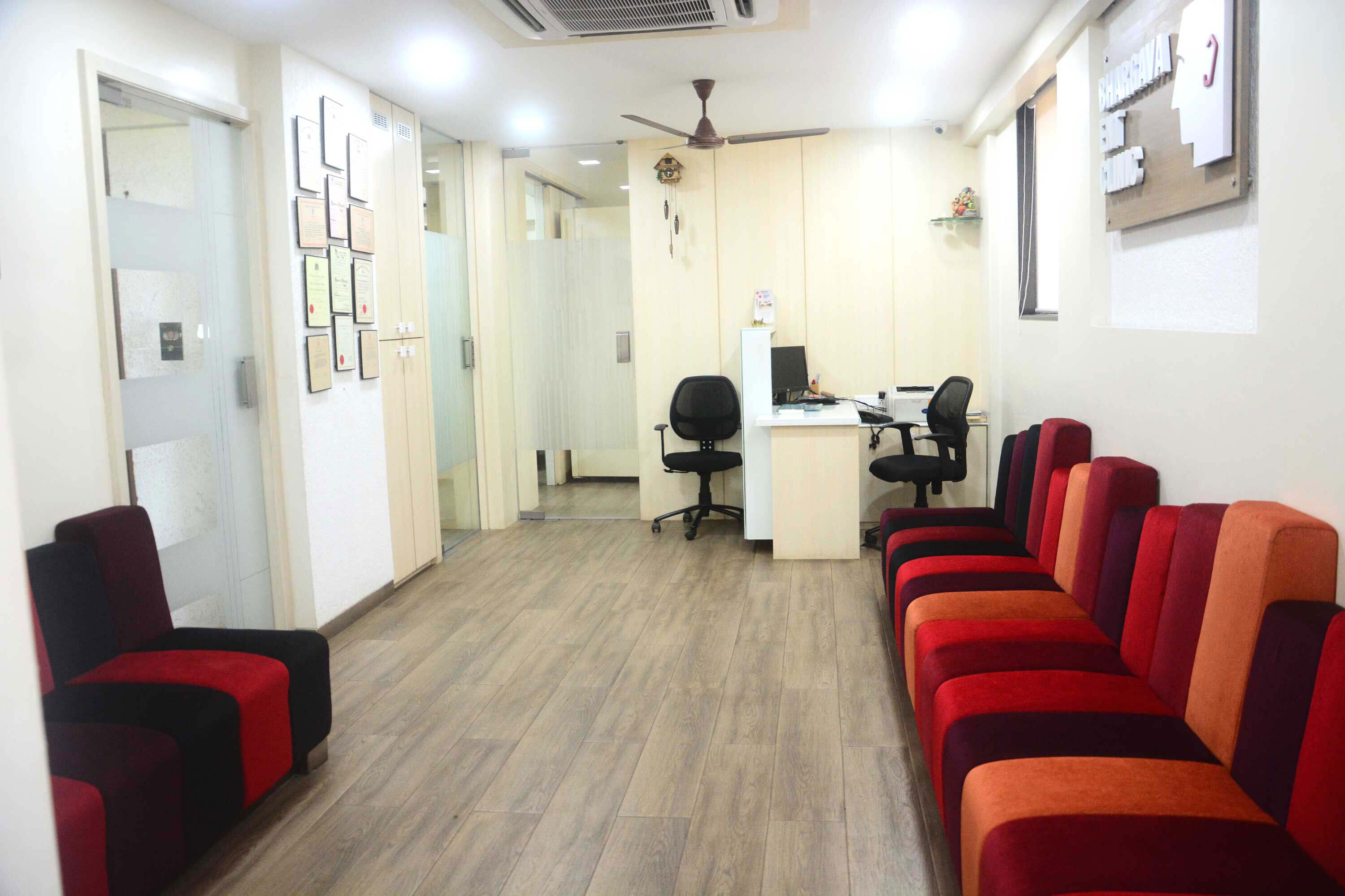 Making a Spartan clinic interesting was our aim while designing this space. Minimalistic design with colorful sofas helped us convert a clinical space into something interesting.