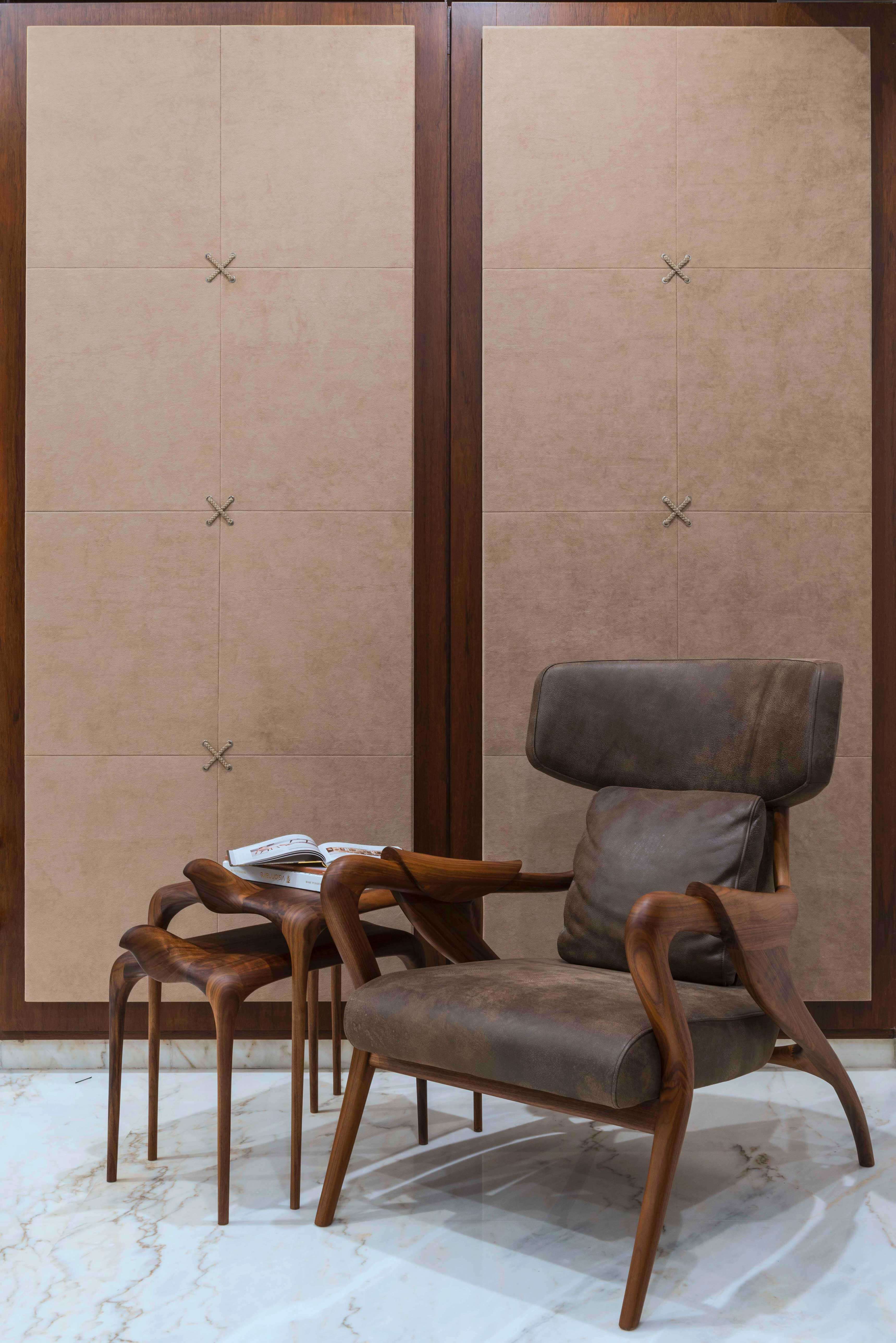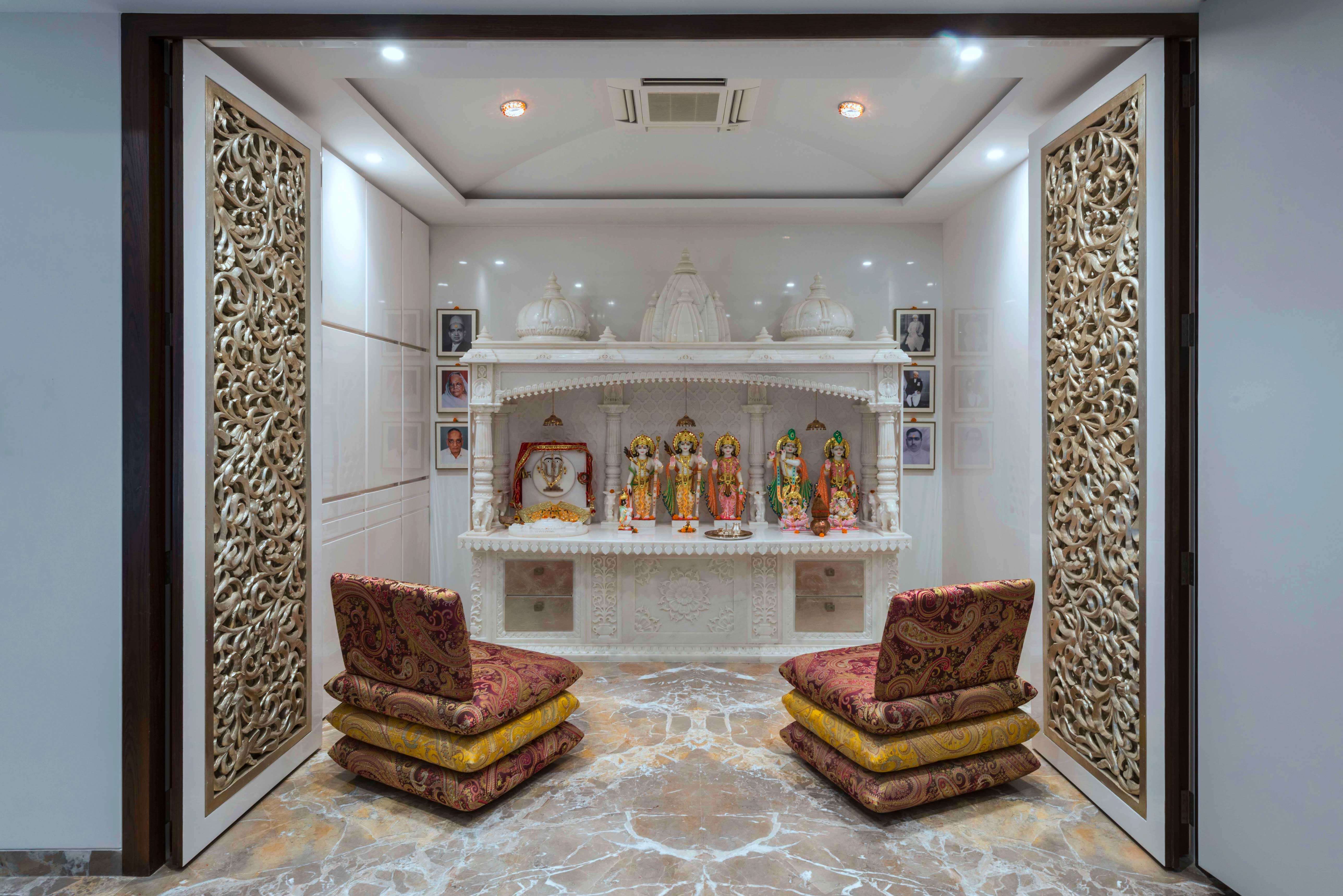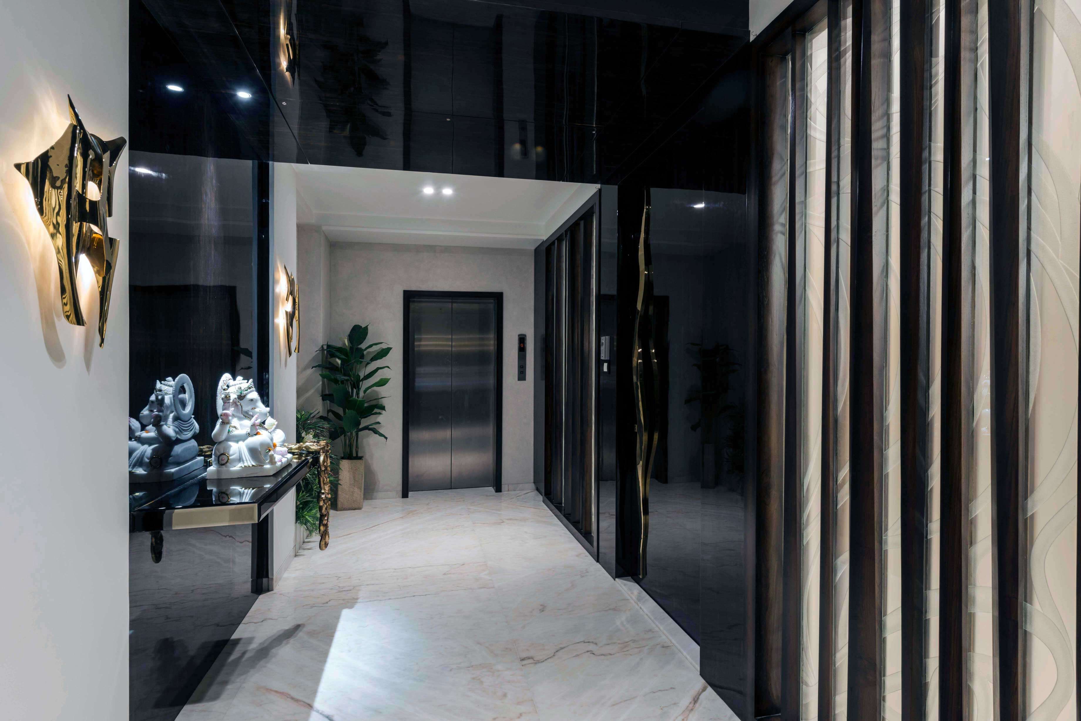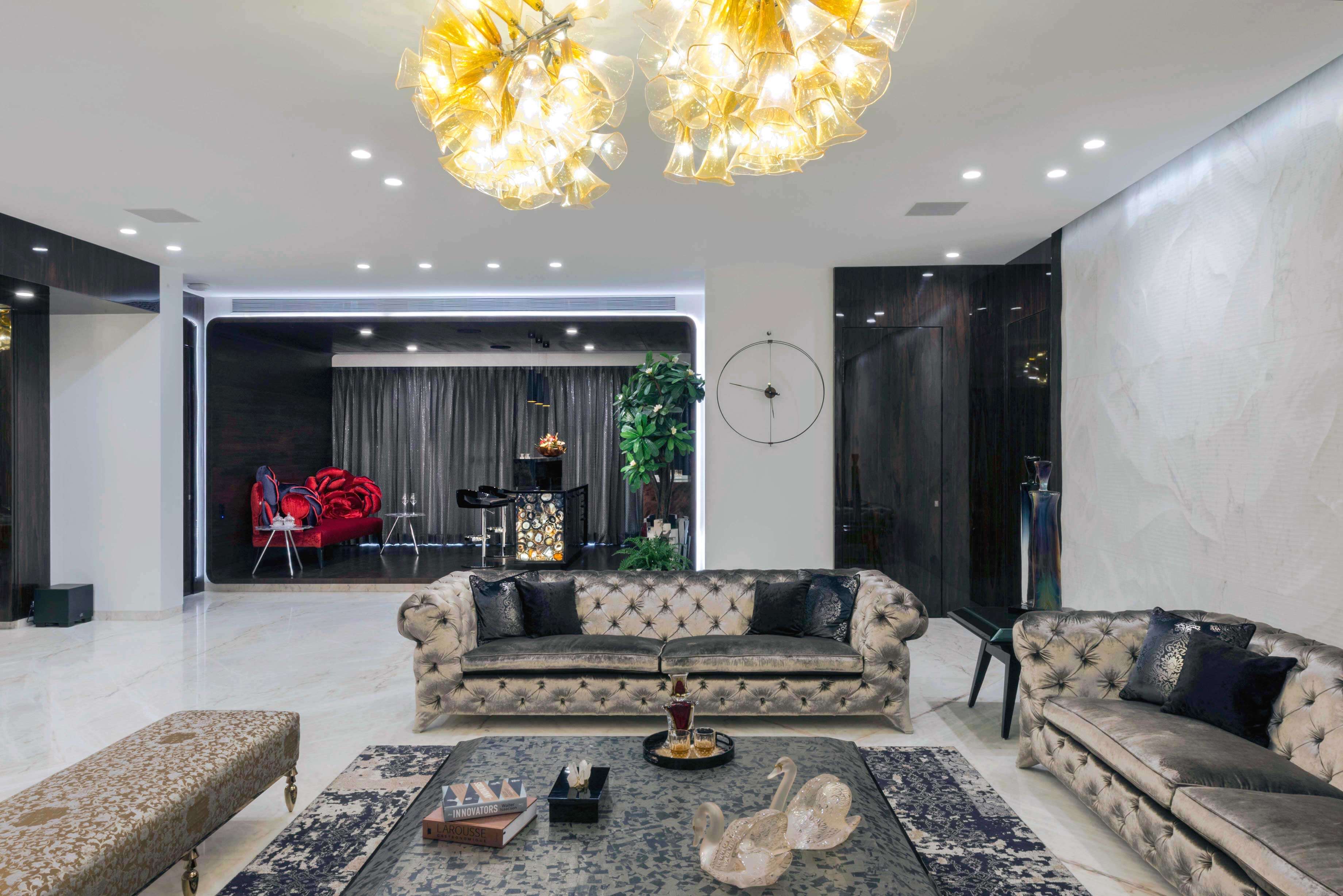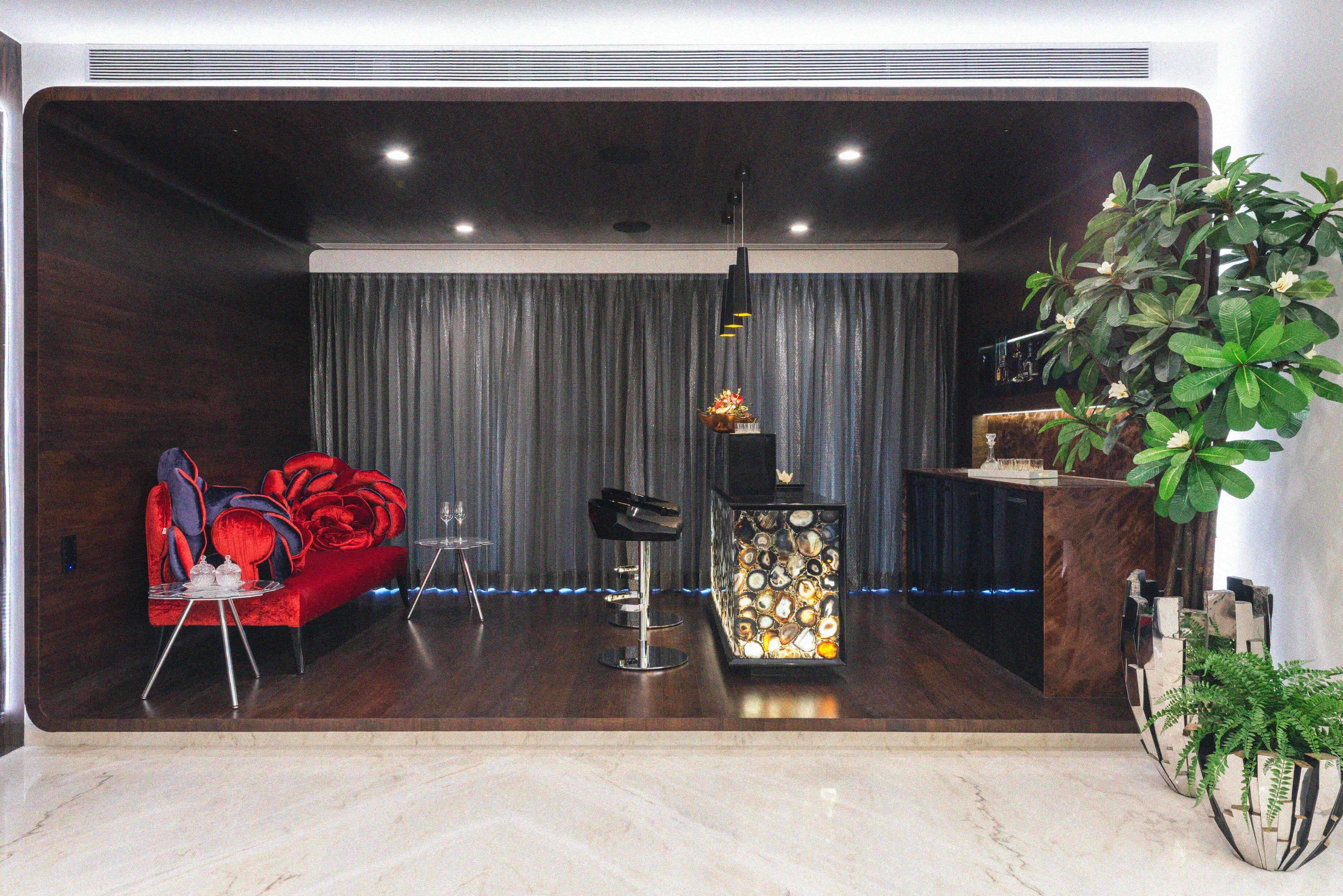 A floor plate of 5000 sq.ft. juxtaposes numerous private and entertainment areas resonating with the client’s style and requirements. A terrace with a Jacuzzi pool outside the Bar area lends the house a very chic and novel ambience. The play of light on the textured stone wall in the living room, and the intricately designed pooja room are the few elements which make this urban home unique.